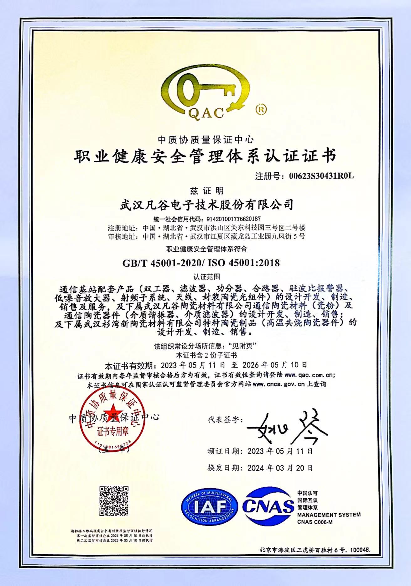 公司自2014年通過OHSAS18001職業(yè)健康安全管理體系認(rèn)證,目前保持有ISO45001:2018管理體系認(rèn)證證書。